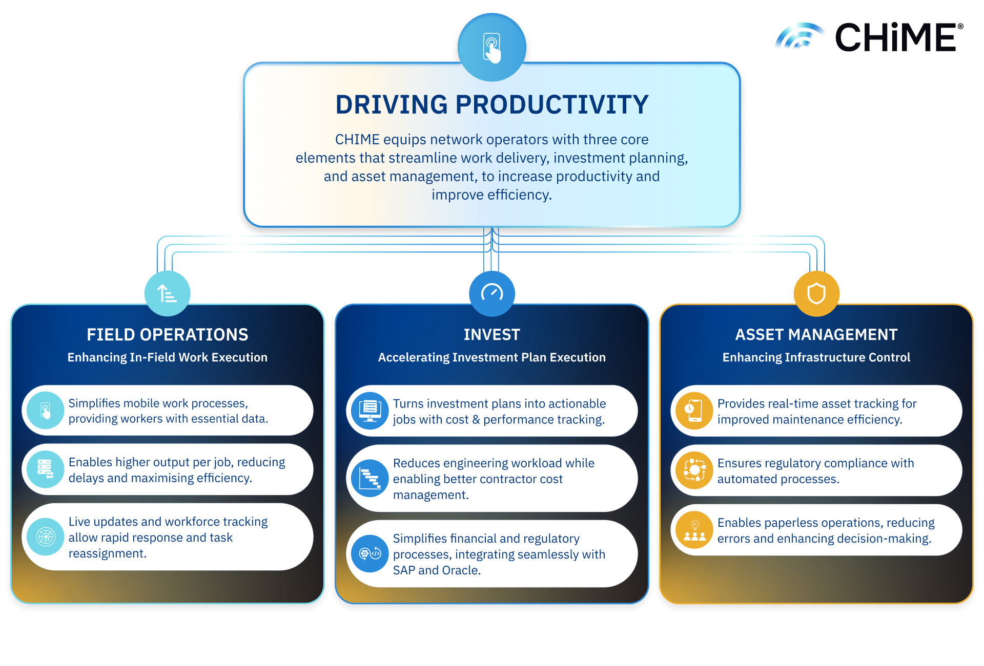 CHIME focuses on both engineering and in-field productivity to deliver higher volumes. CHIME goes beyond scheduling and work management to enable faster work execution, maximising volumes per site visit and reducing the engineering time needed to manage.