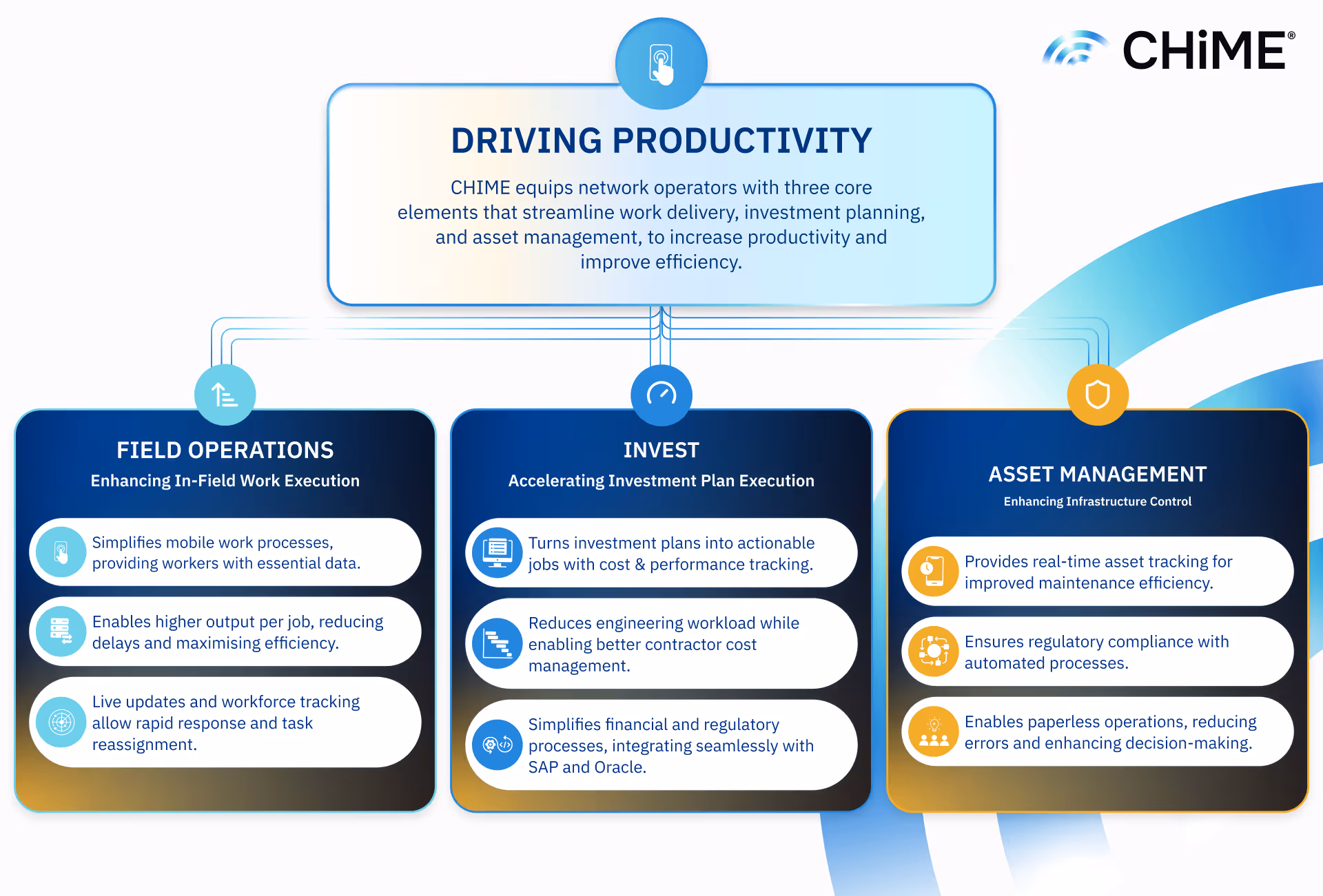With over 25 years of experience, we understand the complexities of regulated industries and the challenges network operators face. CHIME was built to help them overcome these obstacles, improving field force productivity while tackling the industry-wide challenge of increasing regulatory requirements and growing work volumes.