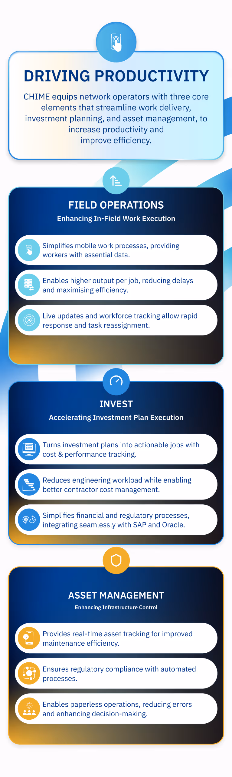 CHIME focuses on both engineering and in-field productivity to deliver higher volumes. CHIME goes beyond scheduling and work management to enable faster work execution, maximising volumes per site visit and reducing the engineering time needed to manage.